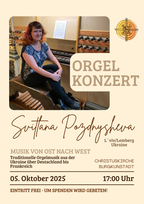 • 05. Oktober, 17:00 Uhr: Konzert in der Christuskirche mit Organistin Svitlana Pozdnysheva