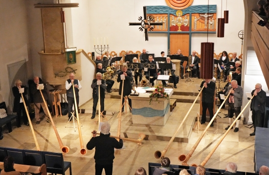Als am Abend die ersten Töne des Allgäuer Hirtenrufs durch die Christuskirche Burgkunstadt hallen, hält das Publikum den Atem an. Die neun Patersberger Alphornbläser füllen nicht nur mit ihren imposanten Instrumenten den Raum vor dem Altar der Christuskirche, sondern öffnen den Zuhörerinnen und Zuhörern dank eines meditativen Klangbildes zugleich die Tür zu einem unvergesslichen Konzerterlebnis. Zu diesem hatte der Posaunenchor der Evangelischen Kirchengemeinde anlässlich des 90. Geburtstages der Christuskirche geladen – und dieser Einladung waren nicht nur zahlreiche Besucherinnen und Besucher, sondern auch weitere Musikerinnen und Musiker gefolgt. Zusammen mit den Patersbergern Alphornbläsern und der kraftvollen Stimme von Mezzosopranistin Svenja Weierich zauberte Thomas Meyer als Organist und Gesamtleiter des Abends ein Programm hervor, das trotz der zahlreichen kirchenmusikalischen Höhepunkte der Vergangenheit einen ganz besonderen Platz in der 90jährigen Geschichte der Christuskirche einnehmen wird.