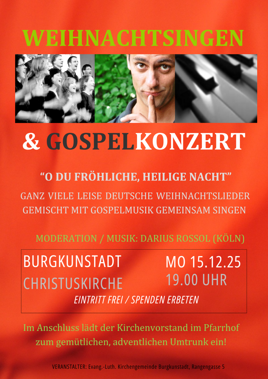 Herzliche Einladung zum traditionellen Adventskonzert unserer Chöre am 2. Advent. Als Gastchor wird auch in diesem Jahr wieder der Männergesangsverein 'Liederkranz 1856 Burgkunstadt' auftreten. Wir freuen uns über ihren Besuch bei freiem Eintritt. Gerne können Sie am Ende der Veranstaltung eine Spende einlegen. Damit unterstützen Sie die vielfältige musikalische Chorarbeit unserer Gemeinde.